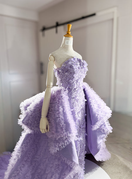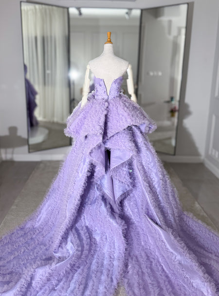 The design is elevated by dramatic side panels of layered ruffled tulle, creating a striking contrast between structure and fluidity. The deep lavender hue adds depth and sophistication, resulting in a powerful yet romantic presence.