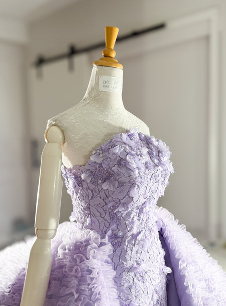 Deep Lavender features a strapless silhouette with a richly embroidered corset, adorned with dimensional floral detailing handcrafted to sculpt the figure with refined precision.