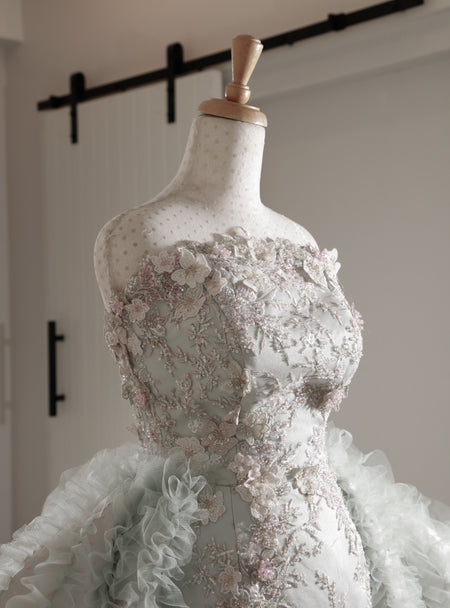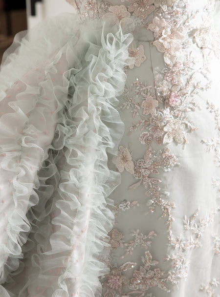 The soft light apple-green hue is delicately blended with blush pink accents, adding a dreamy, romantic dimension to the design. Intricate floral embroidery and airy layers of tulle enhance movement and depth, resulting in a look that feels both ethereal and powerful.