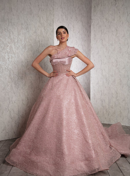 Designed with a graceful one-shoulder silhouette, Rose Blossom features a sculpted corset that enhances the figure with effortless femininity, flowing into a voluminous skirt for a regal, timeless presence.