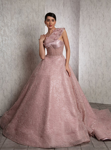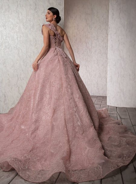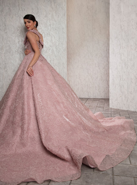 The gown is adorned with delicate, raised rose embroidery, meticulously handcrafted across the fabric to evoke the beauty of blooming petals. Its blush pink tone adds a sense of warmth and romance, while the extended train completes the look with a touch of couture sophistication.