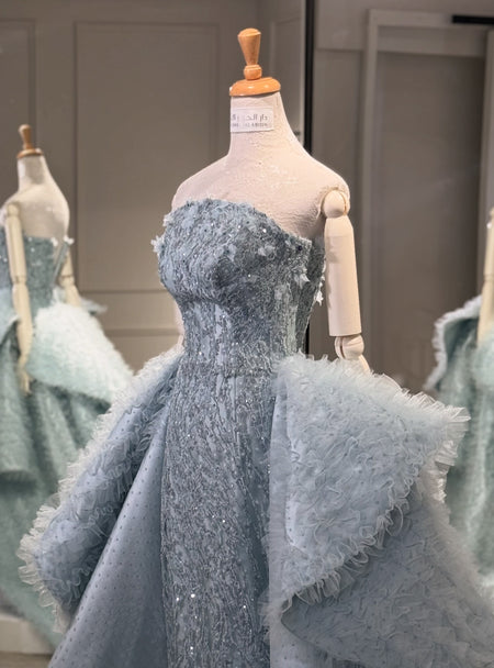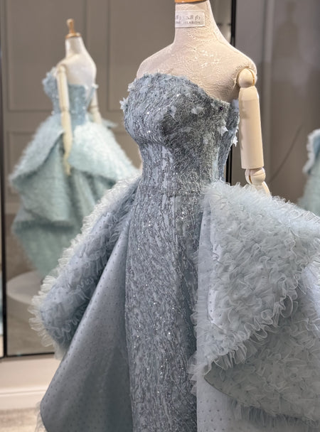 Sky Blue features a strapless silhouette with a delicately embellished corset, crafted to sculpt the figure with graceful precision and couture detail.